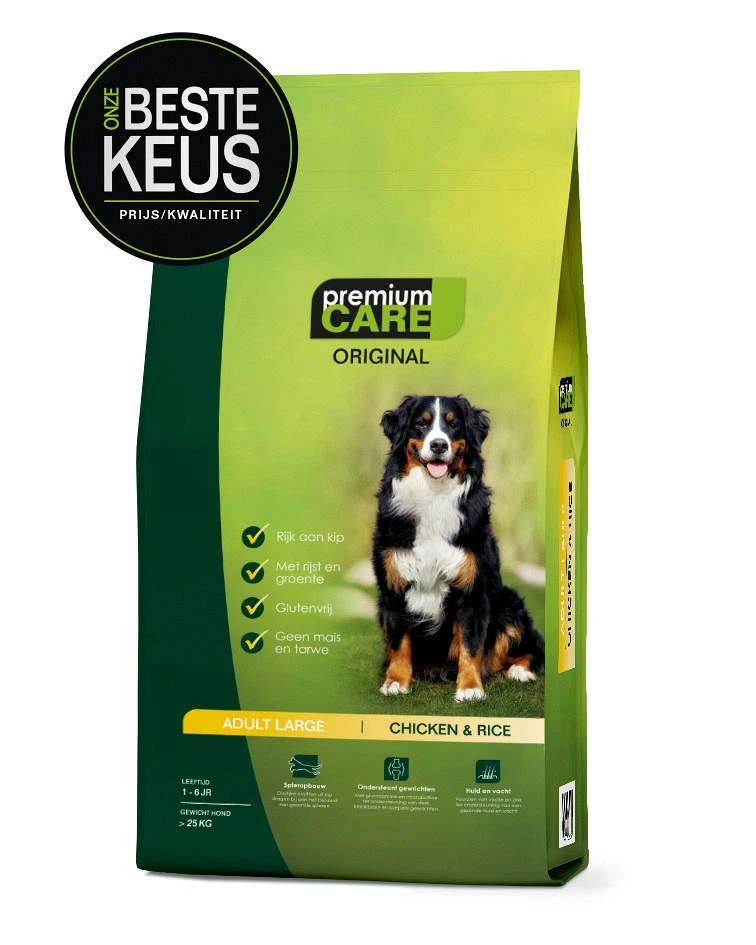 Premium Care Original – Adult Large Chicken & Rice is een glutenvrije, complete droge hondenvoeding voor volwassen honden van grote rassen. Deze speciale formule beantwoordt perfect aan de voedingsbehoeften van grote hondenrassen en draagt bij tot soepele gewrichten en optimale levenskwaliteit.