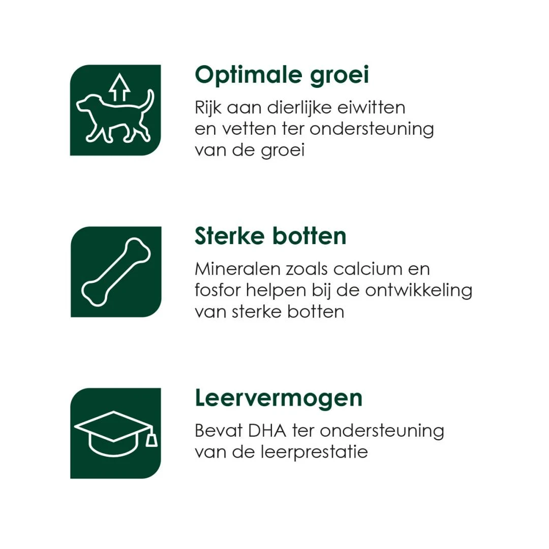 | Optimale groei Rijk aan dierlijke eiwitten en vetten ter ondersteuning van de groei.  |