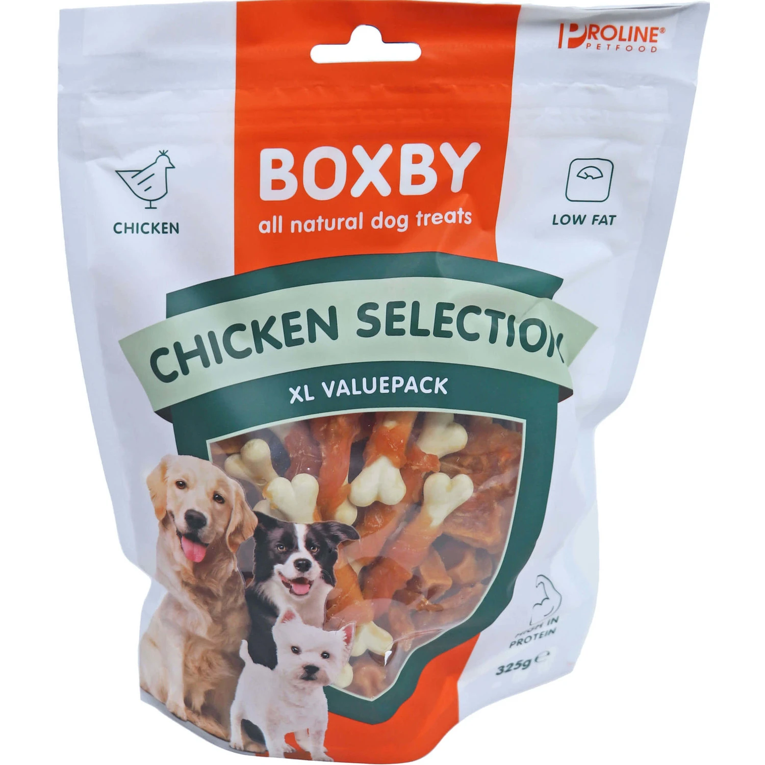 Proline Boxby Chicken Selection valuepack 325 gram is rijk aan eiwitten en laag in vetten. Deze combinatie van de toppers, bone snack, chew sticks, calcium bone en chicken snacks, zorgt ervoor dat u altijd de snack in huis heeft waar uw hond op die dag zin in heeft. De snacks zijn zonder toevoegingen. Wordt geleverd in een hersluitbare verpakking van 325 gram.