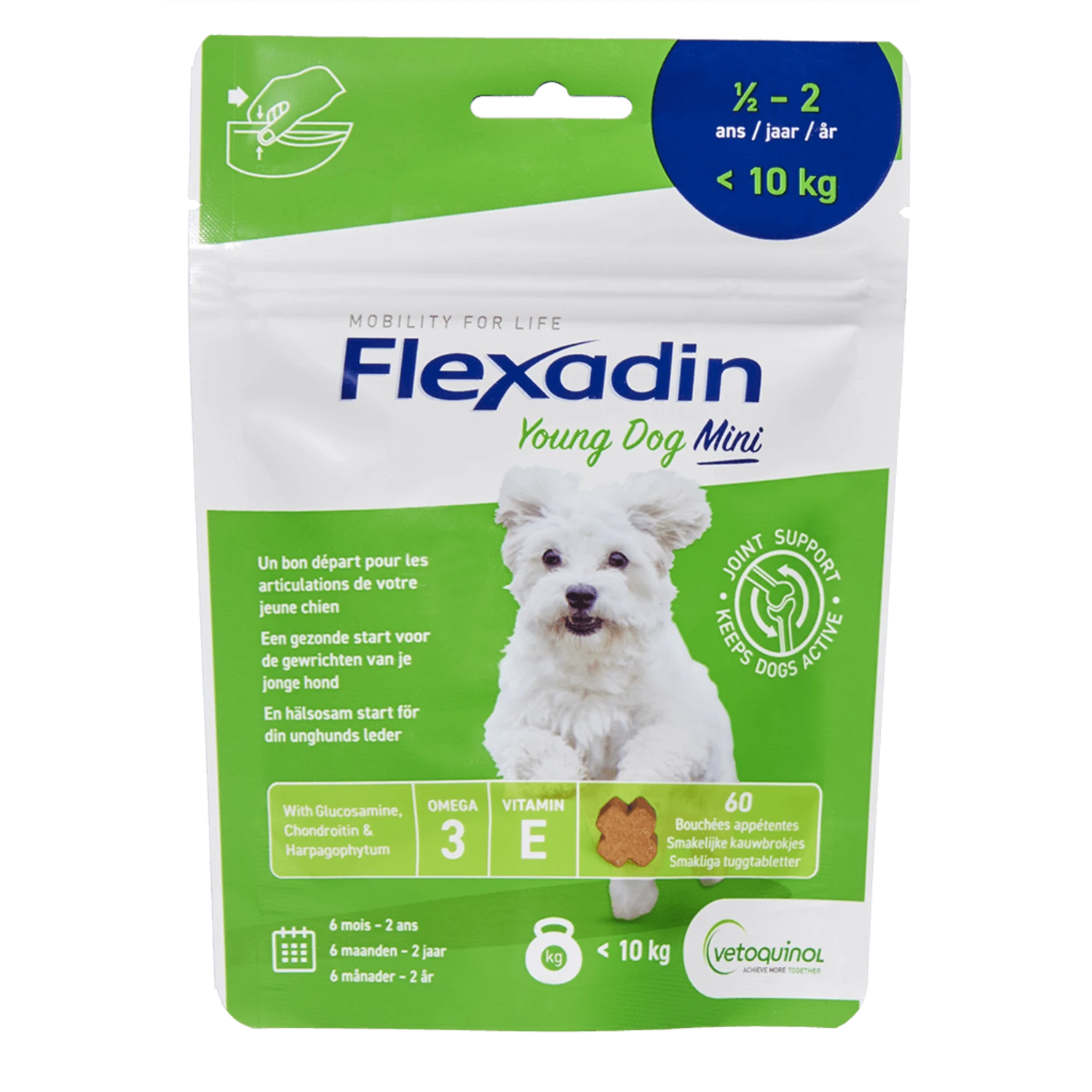 Je opgroeiende hond vraagt heel wat van zijn gewrichten. Daarom werd Flexadin Young Dog Mini ontwikkeld, om aan de specifieke noden van je jonge hond te voldoen en de gewrichten in dit belangrijk stadium zo goed mogelijk te ondersteunen. Flexadin Young Dog Mini is geschikt voor honden jonger dan 2 jaar tot 10kg. Het bevat Glucosamine en Chondroïtine, essentiële bouwstenen voor het kraakbeen, en onder andere Duivelsklauw (Harpagophytum procumbens), een geneeskrachtige plant waarvan het wortelextract al heel lang gebruikt wordt om de gewrichten te ondersteunen.